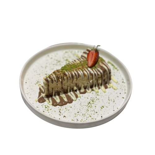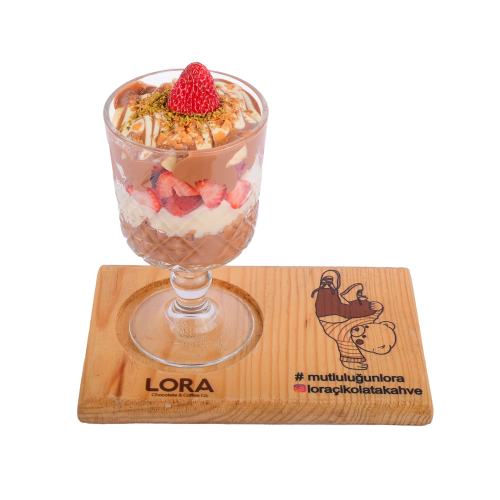 Bardak içerisine Rulo Kat, Muz, Çilek, Çıtır Krep kırıkları ve Belçika sütlü çikolata ile servis edilir.