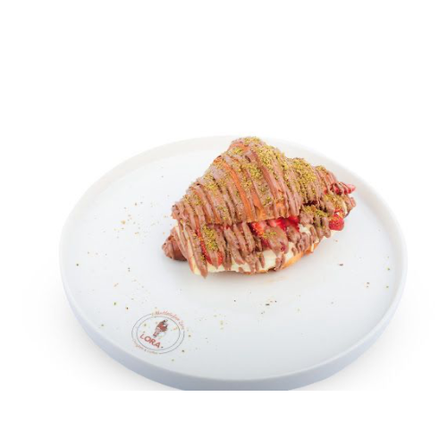 Özel krema, Çilek, Muz, Lotus bisküvi parçaları, Sütlü çikolata ve Krep kırıkları ile servis edilir.