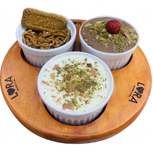Özel krema, Çilek, Muz, Lotus bisküvi parçaları, Sütlü çikolata ve Krep kırıkları ile servis edilir.